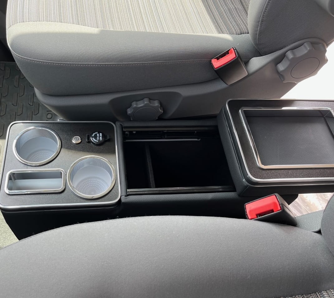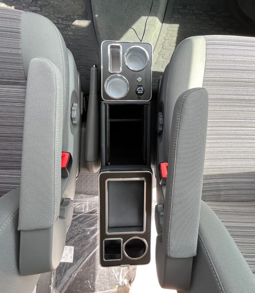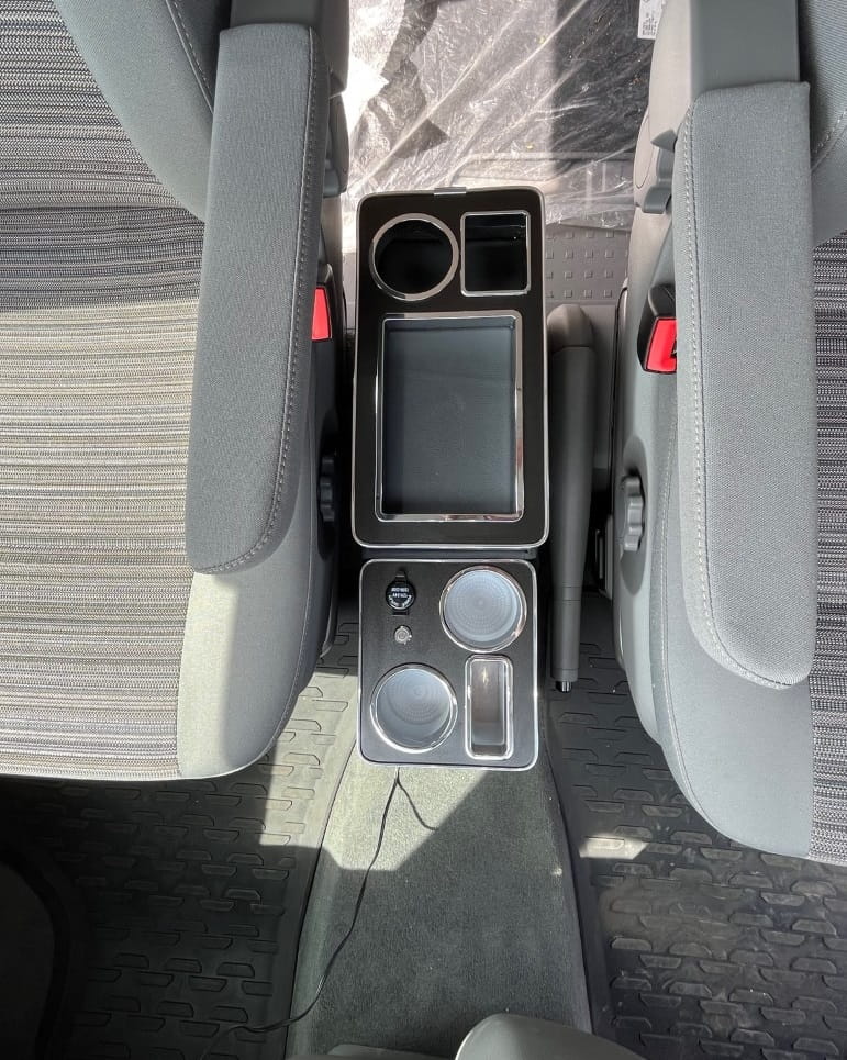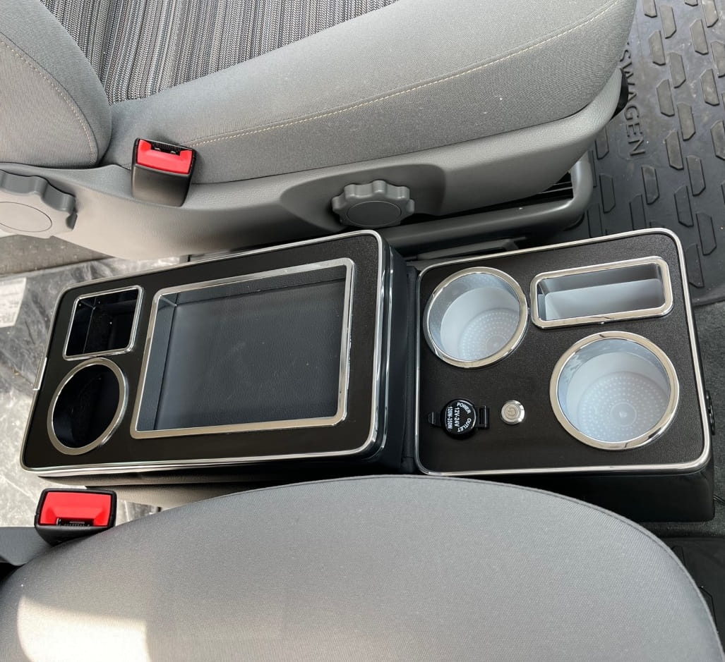 Die Mittelkonsole passt perfekt zum VW T4. T5, T6 und T6.1, die sich harmonisch in ihr Interieur einfügen. Seine präzisen Abmessungen und die sorgfältige Verarbeitung sorgen für eine perfekte Anpassung an den Mitteltunnel des Fahrzeugs und schaffen ein stimmiges und ästhetisches Ganzes. Dadurch erfüllt die Konsole nicht nur ihre praktischen Funktionen, sondern bereichert auch das Erscheinungsbild des Fahrzeuginnenraums.