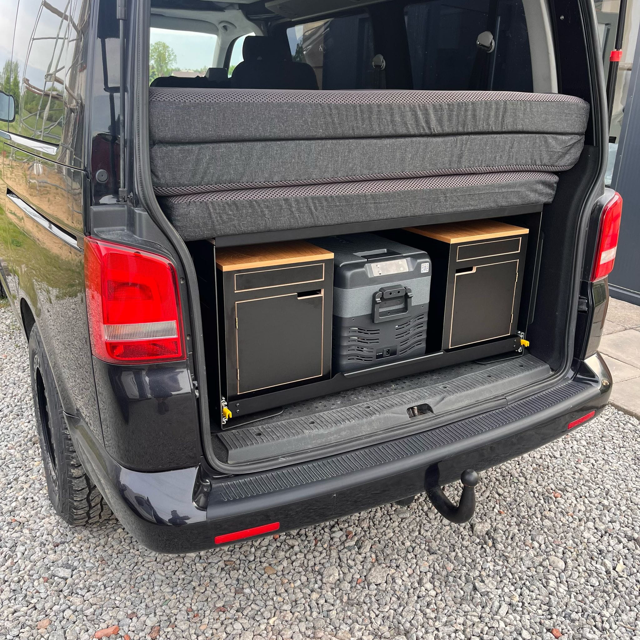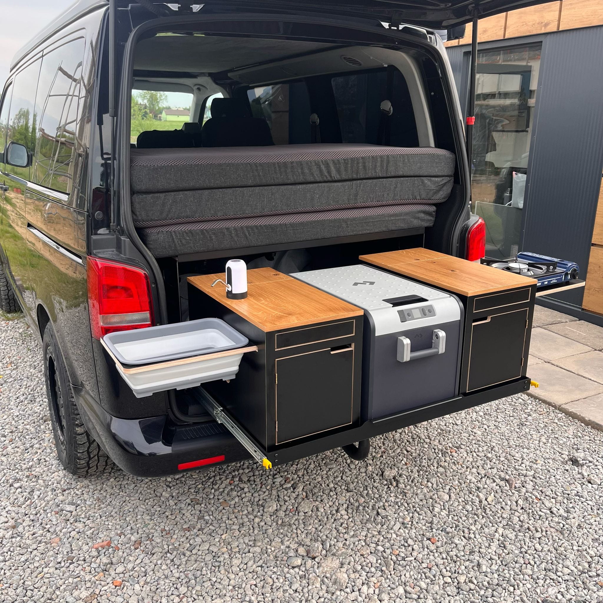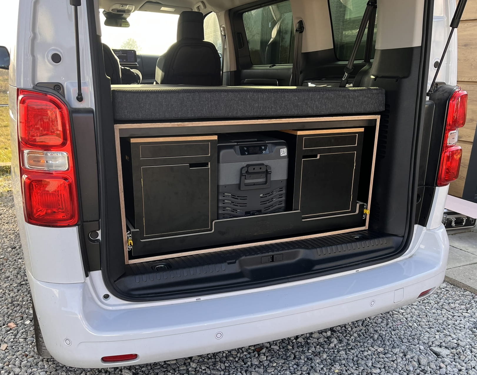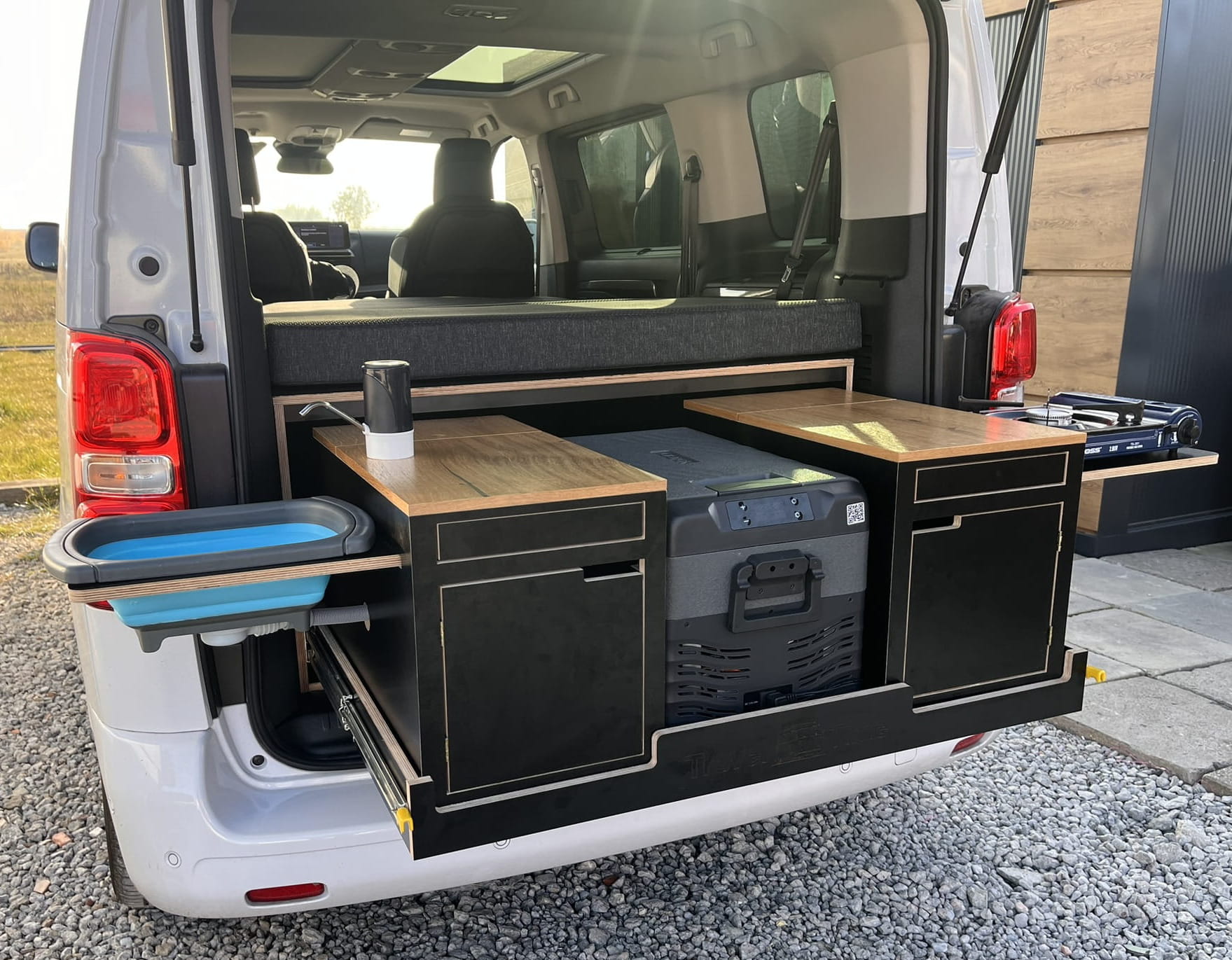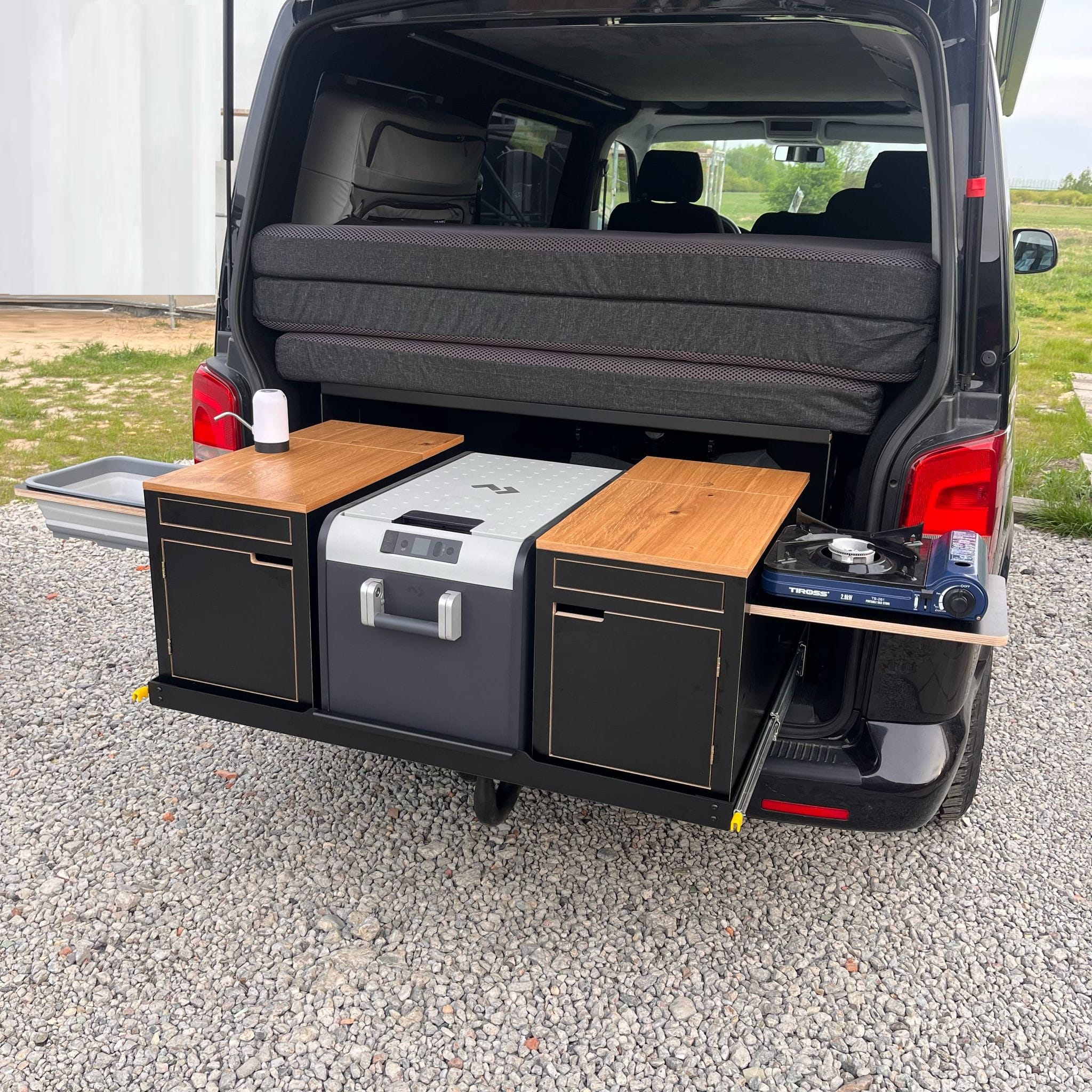 Die ausziehbare Aluminiumschublade ist das Herzstück des Box Kempingowy EXCLUSIVE Systems für den Toyota Proace Verso: